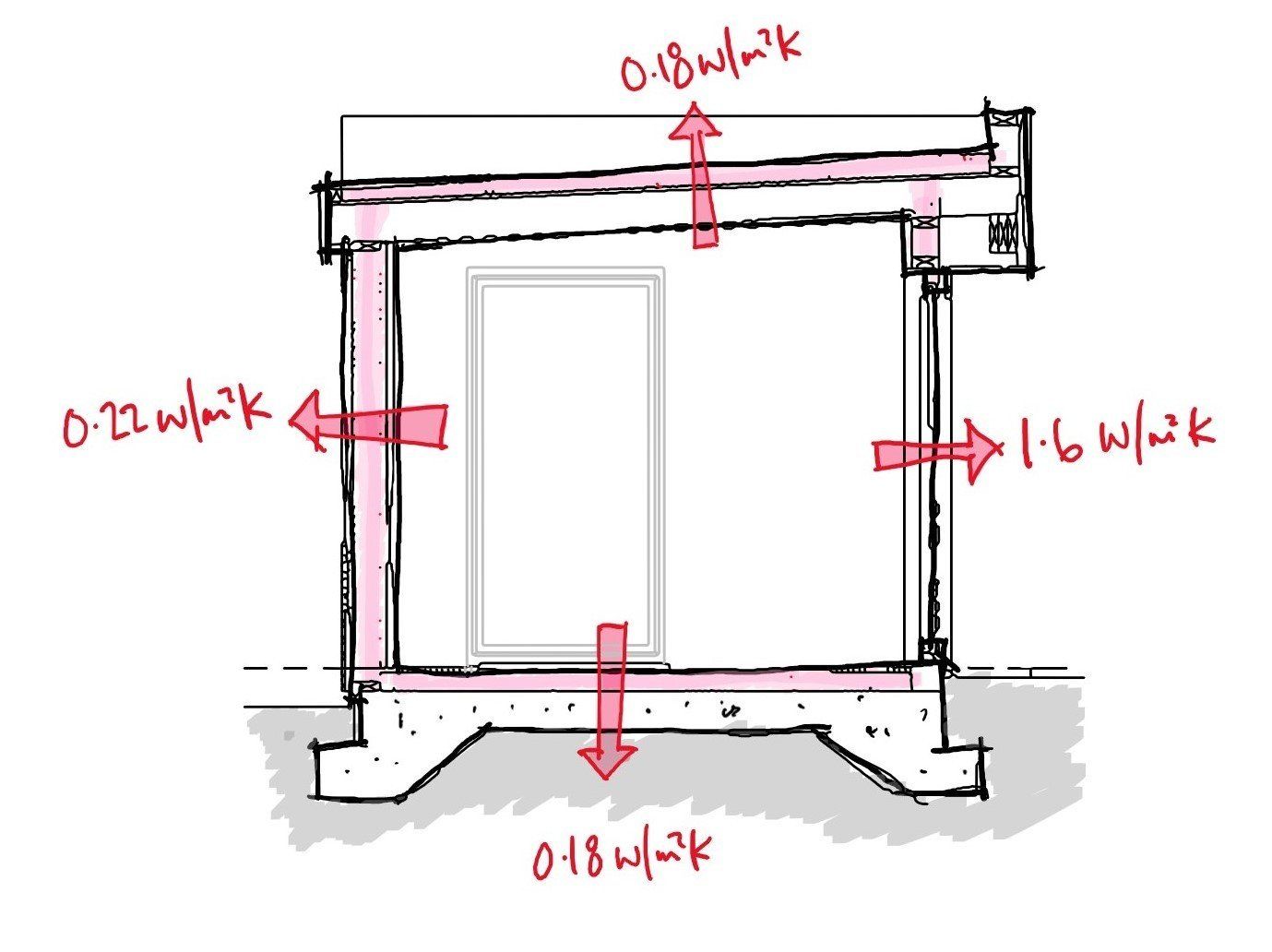 The question is mainly answered by looking at Standard 6.2.9 of the Scottish Technical Standards (Building Regulations): Extensions to the Insulation Envelope Standard 6.2.9 limits the amount of glazing in an extension. The area of glazing should be limited to 25% of the extension floor area plus any existing openings which are being built over. For example: a 20m2 extension to the rear of a house which is accessed by removing the existing patio doors from the Lounge can have a maximum allowable glazed area of 20m2 x 25% = 5m2, plus the area of the existing patio doors (say 4m2). So the maximum allowable glazed area of the new extension is 9m2. Equivalent to a 4.2m wide bi-fold door. Keeping the design within these parameters allows you to gain building warrant approval using the standard U-Values in table 6.5 of regulation 6.2.9. I explain a bit of the theory of heat loss and U-Values in another article in relation to Garden Rooms.